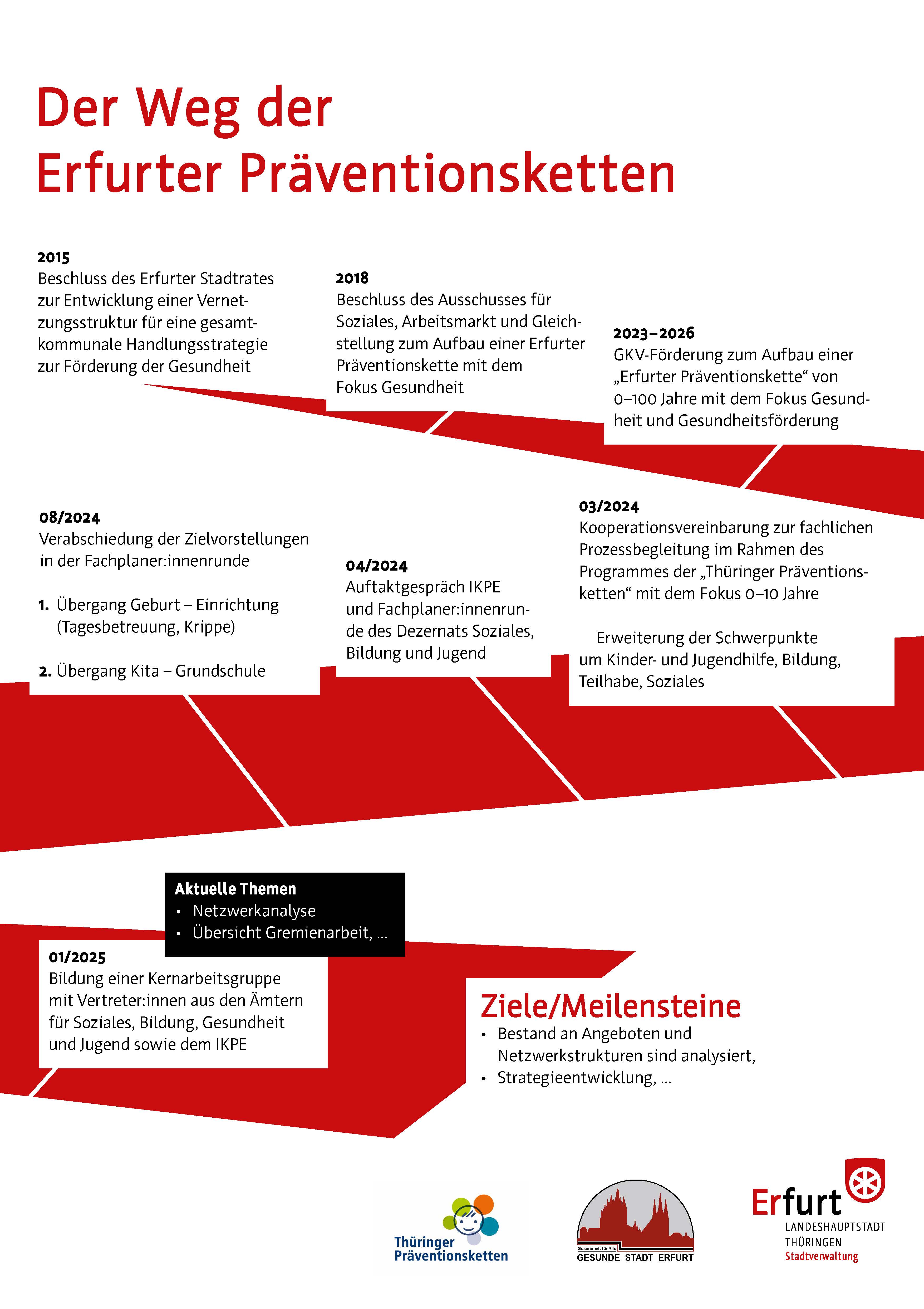 Die Landeshauptstadt Erfurt beteiligt sich seit April 2024 am Programm Thüringer Präventionsketten. In der Altersgruppe von 0-10 Jahren sollen sowohl der Übergang zwischen Geburt und Eintritt in Einrichtungen als auch zwischen Kindergarten und Schule im Fokus stehen. Dazu werden vorhandene Netzwerkstrukturen und Angebote analysiert. Aus diesen Erkenntnissen sowie aus den aktuellen Daten der Schuleingangsuntersuchungen werden Bedarfe erhoben und Lücken evaluiert, um darauf passgenau reagieren zu können. Ein Ziel ist es, niedrigschwellige, öffentlichkeitswirksame und zielgruppenorientierte Strategien zu entwickeln. Mittelfristig werden sie Bestandteil einer gesamtstädtischen Sozialraumstrategie, für die der Stadtrat der Stadtverwaltung den Auftrag gegeben hat.