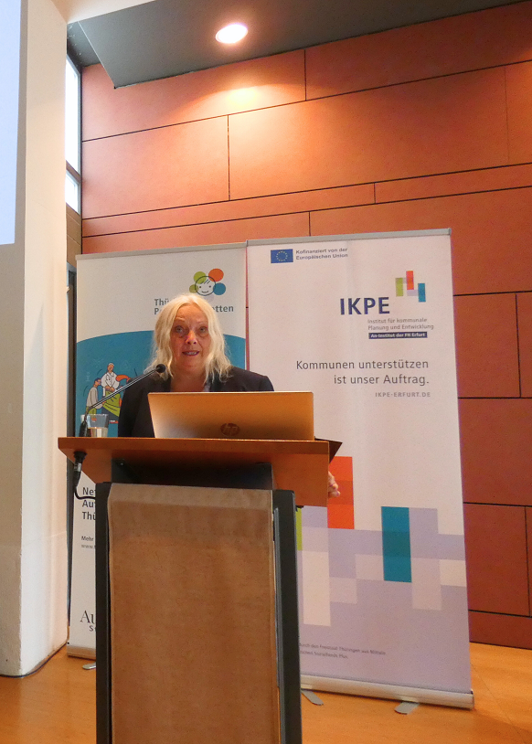 Der Fachtag wurde mit zwei Abschlussinputs beendet. Sabrina Pott, Sozialplanerin aus Stuttgart, gab wertvolle Einblicke in die Beteiligungspraktiken ihrer Stadt und ermöglichte einen Perspektivwechsel. Sie betonte die Wichtigkeit der kontinuierlichen Reflexion und Qualitätsentwicklung in Beteiligungsprozessen. In der abschließenden Reflexion des Instituts für kommunale Planung und Entwicklung e.V. fasste Dr. Heike Schaarschmidt zusammen, dass die Lebensweltperspektive der Adressat*innen erforderlich sei und die professionelle Perspektive ergänze. Sie motivierte, die Menschen in ihren Alltagsbezügen aufzusuchen, teilhaben zu lassen und Angebote davon ausgehend zu gestalten. Niedrigschwellige Beteiligung habe sehr viel mit Haltung der Akteur*innen zu tun, was über den gesamten Fachtag immer wieder aufgezeigt wurde.