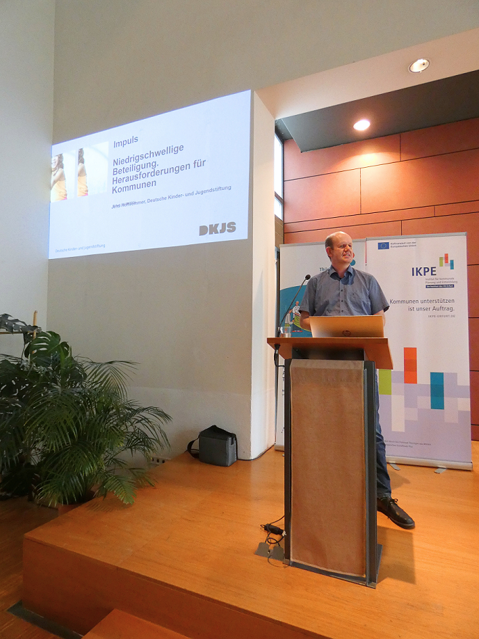 Jens Hoffsommer von der Deutschen Kinder- und Jugendstiftung beleuchtete die Herausforderungen der niedrigschwelligen Beteiligung für Kommunen. Kommunen stehen vor Besonderheiten, wenn es um langfristige Prozesse und die Einbindung junger Menschen geht. Beteiligung müsse spontan und zugänglich sein, etwa durch Bürgercafés oder Planspiele. Jens Hoffsommer hob hervor, dass es wichtig ist, Beteiligungsprozesse an die Lebenswelten der Zielgruppen anzupassen und „Handlungsmut“ zu zeigen, um auch in schwierigen Situationen Veränderungen zu ermöglichen.