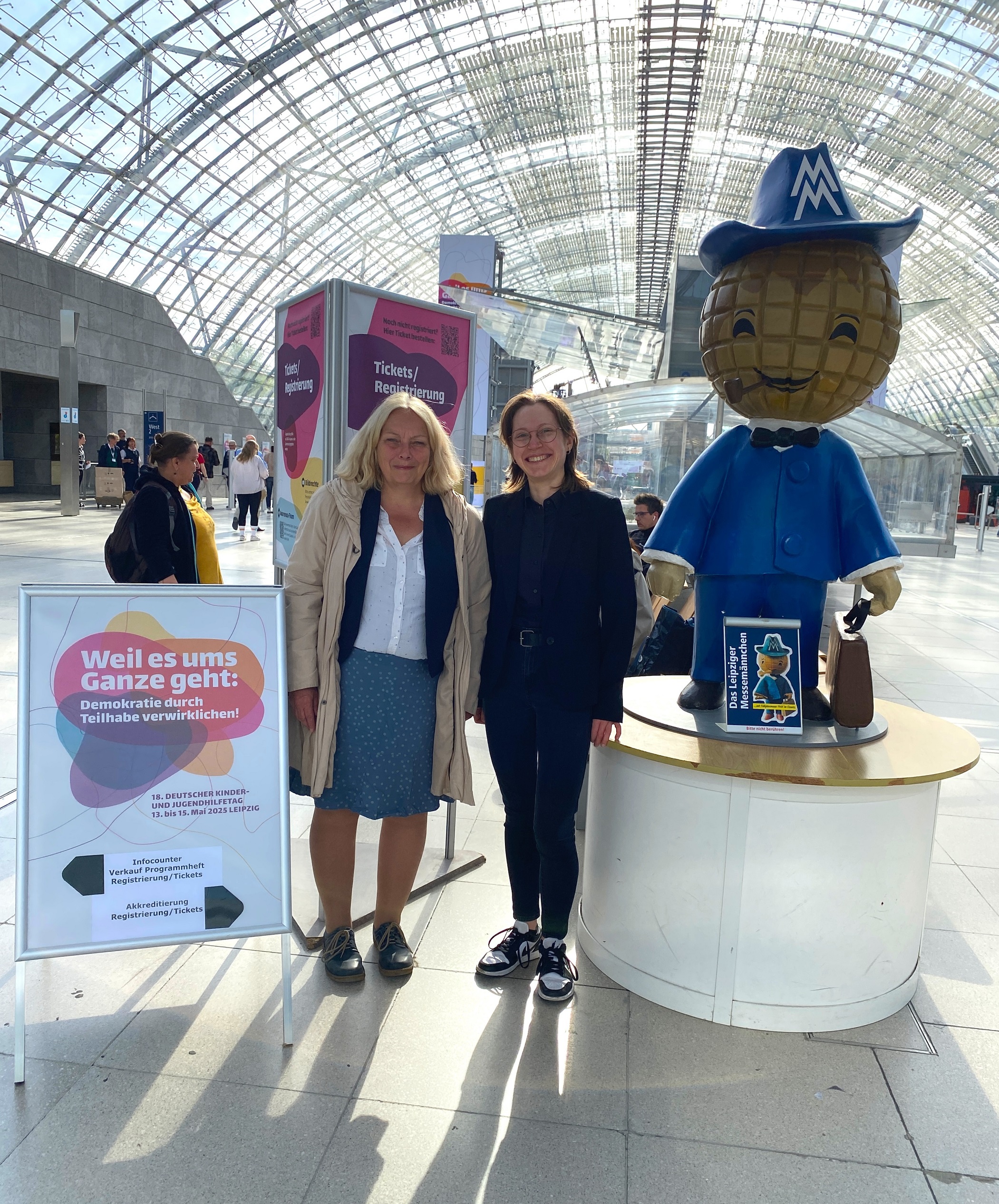 Bild 5: Dr. Heike Schaarschmidt und Julia Bäring mit dem Leipziger Messemännchen