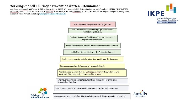 Darüber hinaus nutzten wir verschiedene Qualifikationsmodule um gemeinsam mit den Koordinationsfachkräften die zukünftige Ausrichtung der Prozessbegleitung weiterzudenken und ein Thüringer Wirkungsmodell für die kommunale Präventionskettenarbeit zu entwickeln.